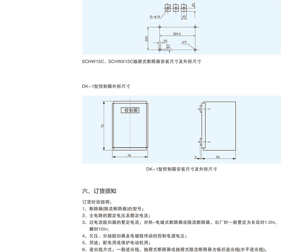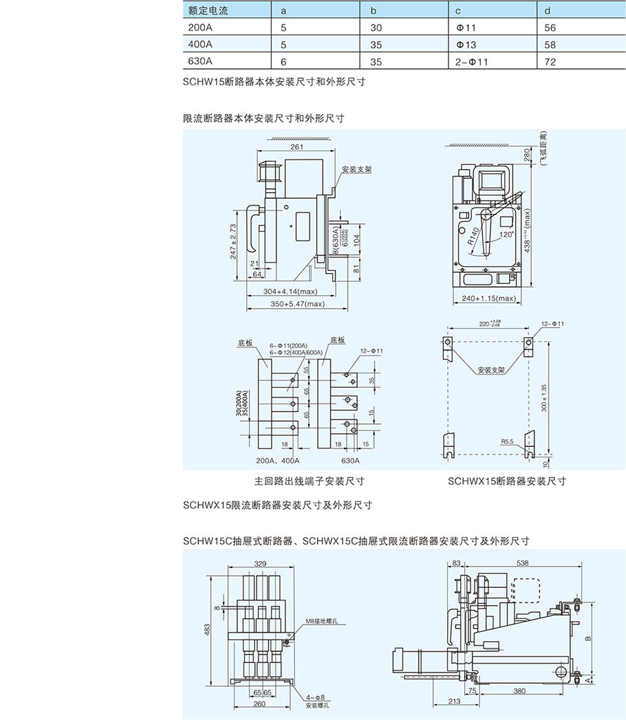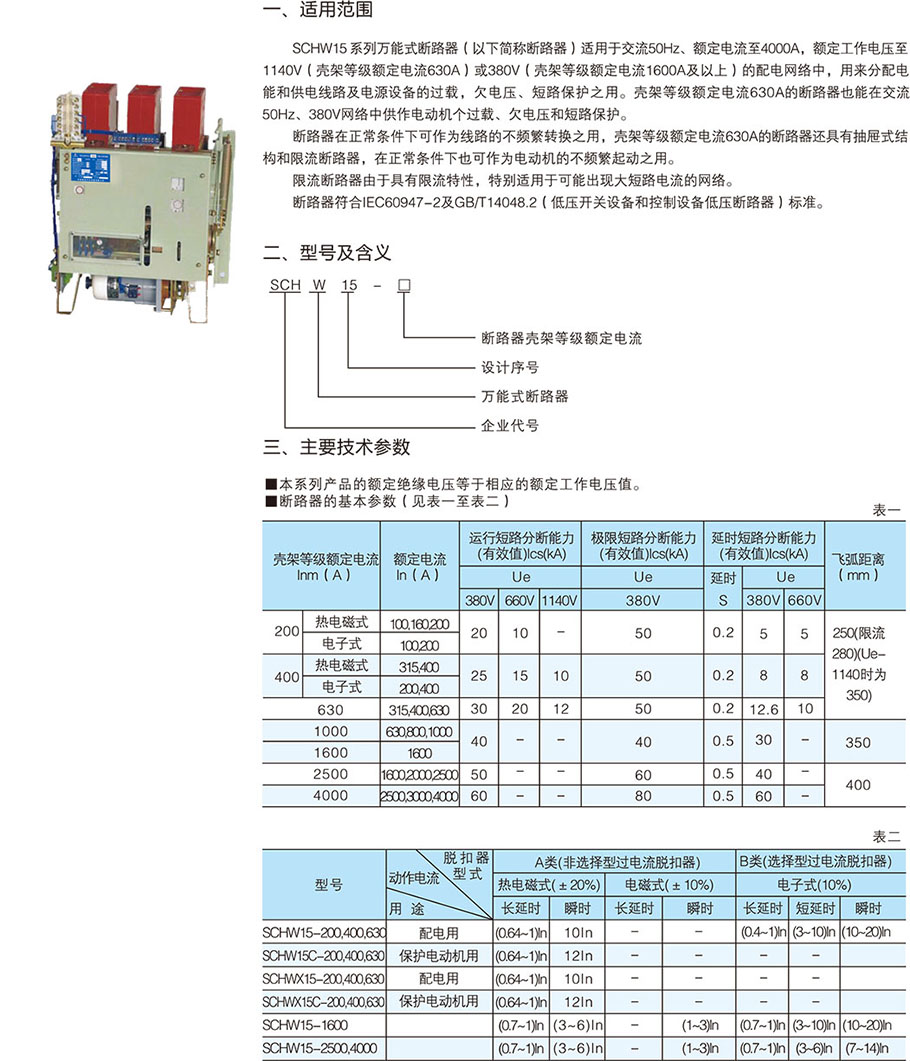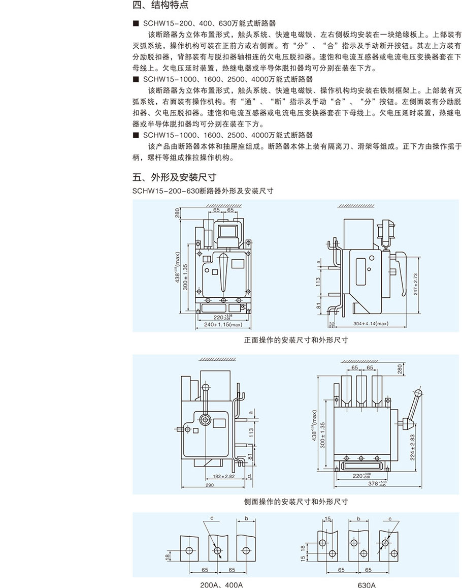 CW1萬能式斷路器功能介紹:斷路器為立體布置方式,觸頭體系、瞬時過電流脫扣器左右側(cè)板均安裝在一 塊絕緣板上。上部裝有滅弧體系,操作組織可裝在正前方或右側(cè)面,有“分”、“合”指示及手動斷開 按鈕。其左上方裝有分勵脫扣器,背部裝有與脫扣半軸相連的欠電壓脫扣器。速飽和電流互感器或電流 電壓變換器套在下母線上。欠電壓延時設(shè)備、熱繼電器或半導(dǎo)體脫扣器可分別裝在下方。 DW15-2000、 3200、4000、6300斷路器為立體布置方式,由底架、側(cè)板、橫梁構(gòu)成框架,每相觸頭體系安裝在底架上, 上面裝滅弧室。操作組織在斷路器右前方,通過主軸與觸頭體系相連。電動操作組織通過方軸與組織連 成一體裝于斷路器下部,作為斷路器的貯能或直接閉合之用,貯能后的閉合由釋能電磁鐵承當(dāng)。在左側(cè) 板上方裝有防回跳組織,以防止斷路器在斷開時彈跳。各種過電流脫扣器按不同請求裝在斷路器下方, 欠電壓,分勵脫扣器及電動操作控制部分裝在左側(cè),其中欠電壓、分勵脫扣器通過脫扣器與放大組織相 連,以減少斷路器的脫扣力。12對輔助觸頭供用戶聯(lián)接二次回路用,面板上有顯示斷路器工作位置的指 示牌“1”“0”和“貯能”指示,還有供合閘及分閘用的按鈕“1”“0”(均按下)。DW15-1000、 1600斷路器附有正面手動操作手柄;DW15-2500、4000附有維修用的手動操作手柄(均可卸下)。